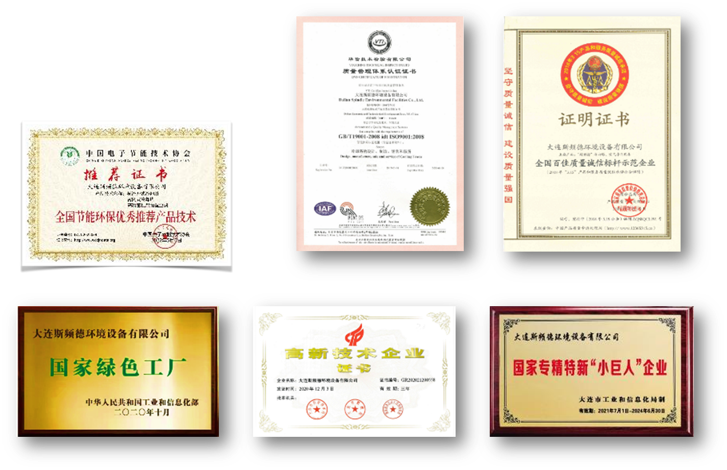公司荣获高新技术企业认证、国家级专精特新小巨人企业、辽宁省企业技术中心、辽宁省工业设计中心等证书,获得质量、环境、职业健康安全、信息安全等管理体系认证,欧盟CE认证、FM认证等证书,被评为国家级绿色工厂。