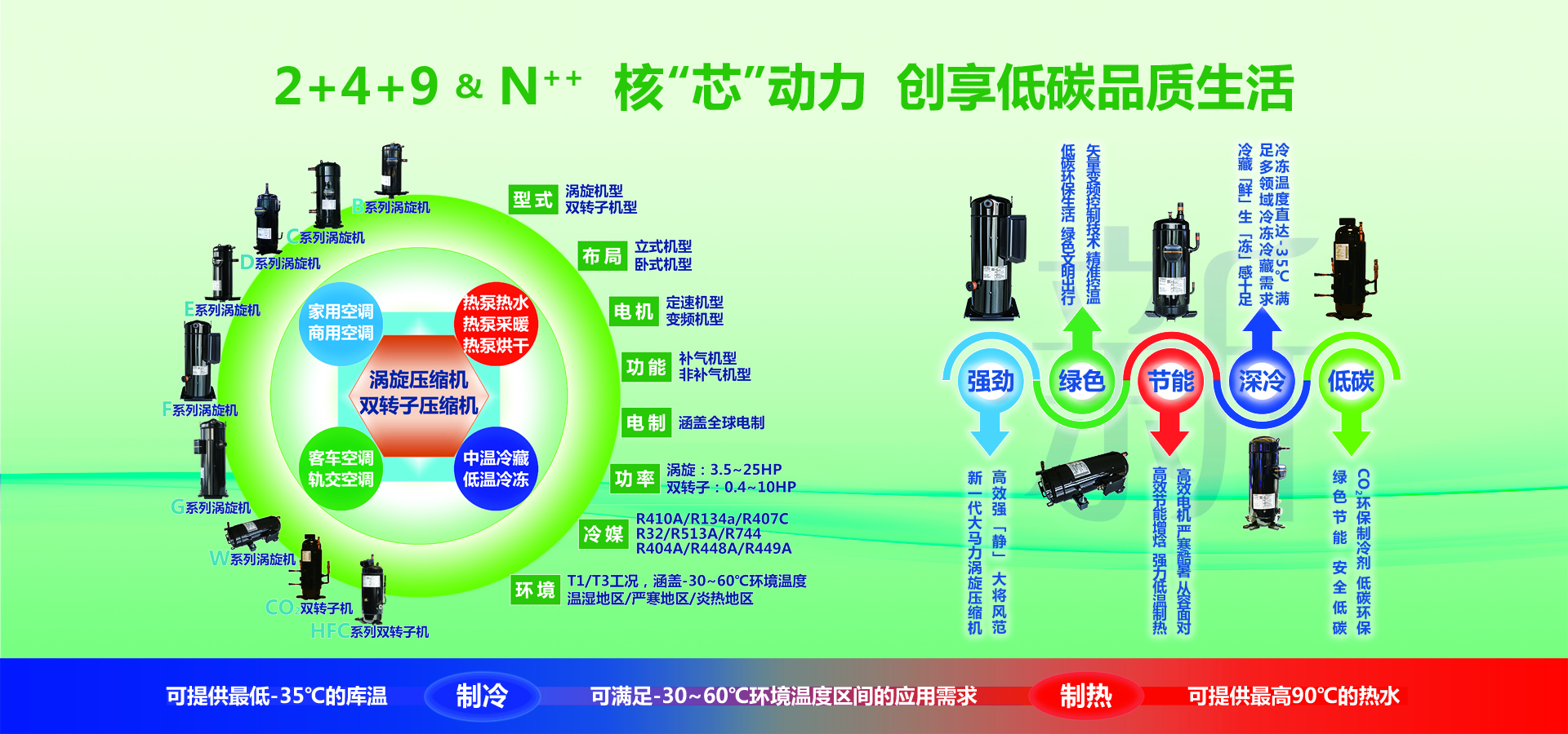 近年来,通过智能制造和领先的品控战略,公司在商用空调、工业、车载、热泵、医用、冷冻冷藏等领域已发展成为全场景应用的综合压缩机制造商。公司产品分为两大类别:涡旋压缩机和双转子压缩机;九大系列:B系列、C系列、D系列、E系列、F系列、G系列、W系列、CO2系列、HFC系列。产品有立式和卧式两种布局型式,又分为定频和变频两种电机型式,产品适用电制广泛,适配冷媒丰富,最大输出功率范围可达25HP。